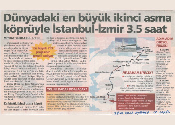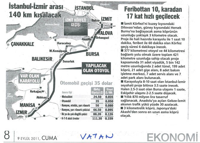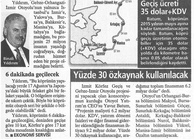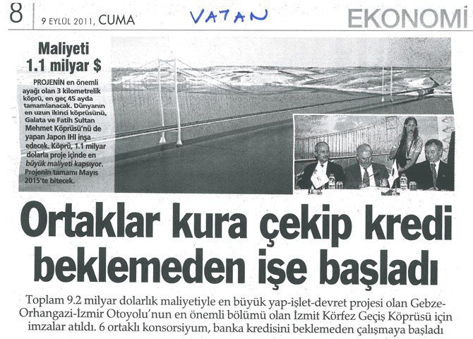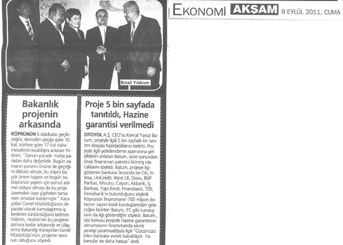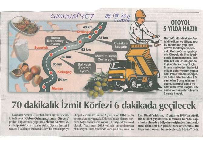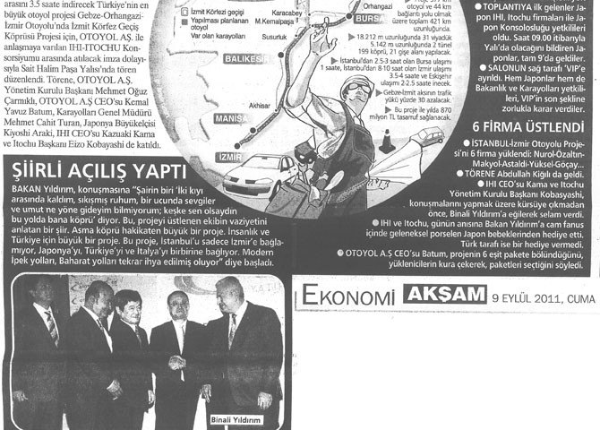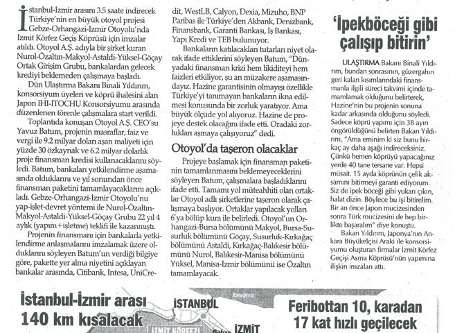 Gebze-Orhangazi-İzmir Otoyolu Projesini gerçekleştirecek olan Nurol, Özaltın, Makyol, Astaldi Yüksel ve Göçay firmalarından oluşan grubun kurduğu Otoyol A.Ş. İzmit Körfez Geçiş Köprüsü için 08.09.2011 günü İstanbul Sait Halim Paşa Yalısı’nda Japon IHI-Itochu Konsorsiyumu ile sözleşme imzaladı.